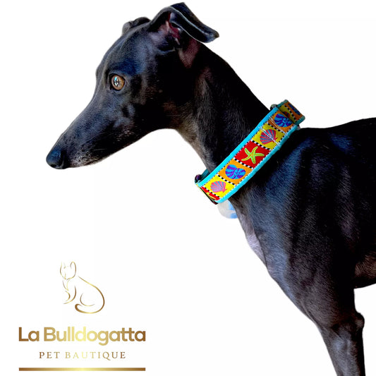 Collari, martingala e guinzagli per levrieri in tessuto, ecopelle, pelle e biothane, personalizzabili nelle misure e con ricami e incisioni al laser.