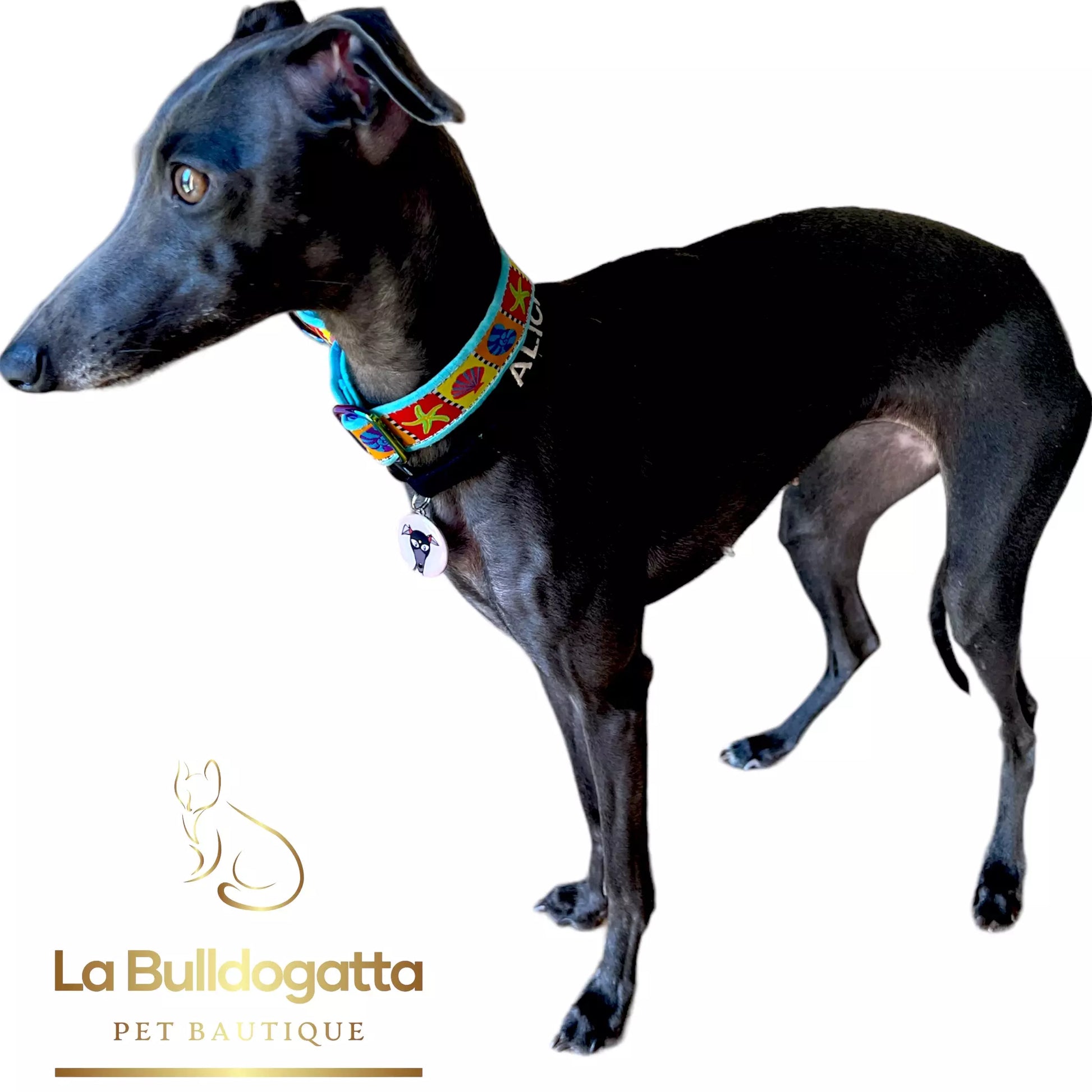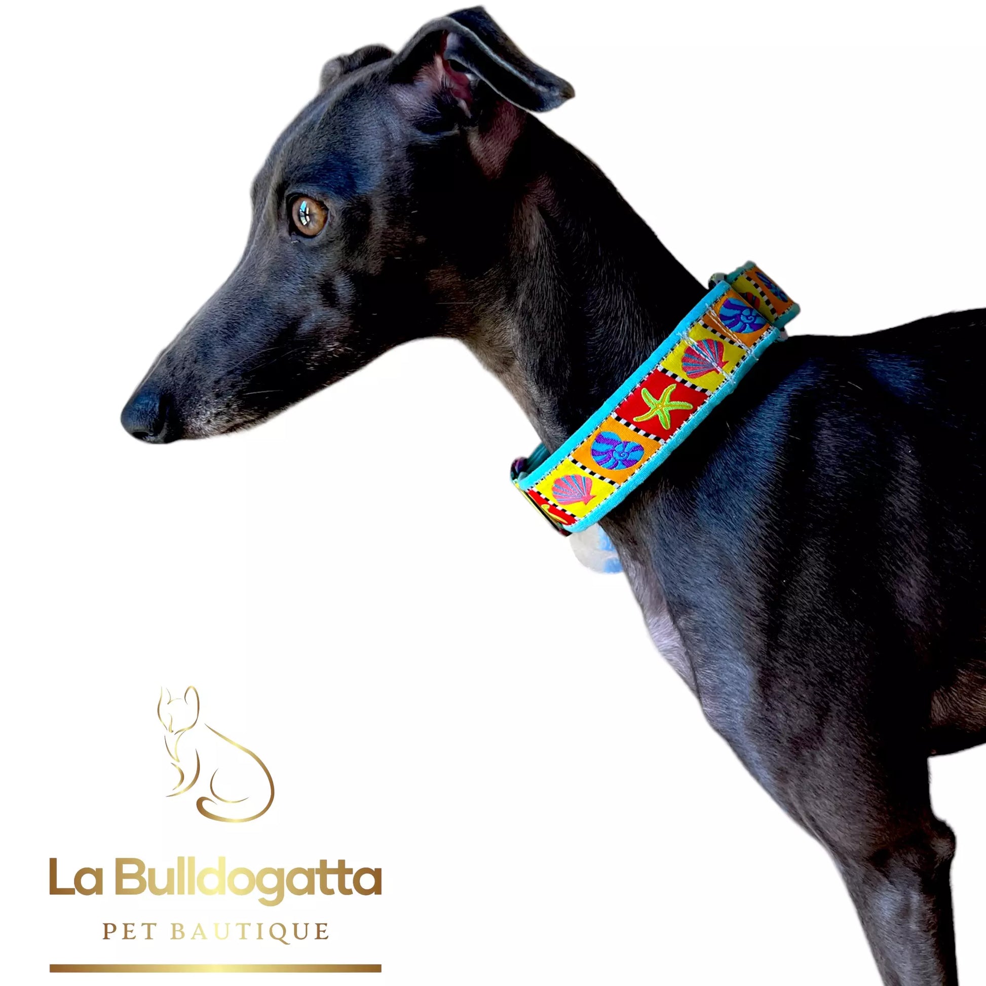 Martingala a semistrozzo per levriero, altezza 2,5 cm, fantasia marine, parti in metallo nero, fettuccina in nylon all'interno per garantire sempre tenuta e resistenza.