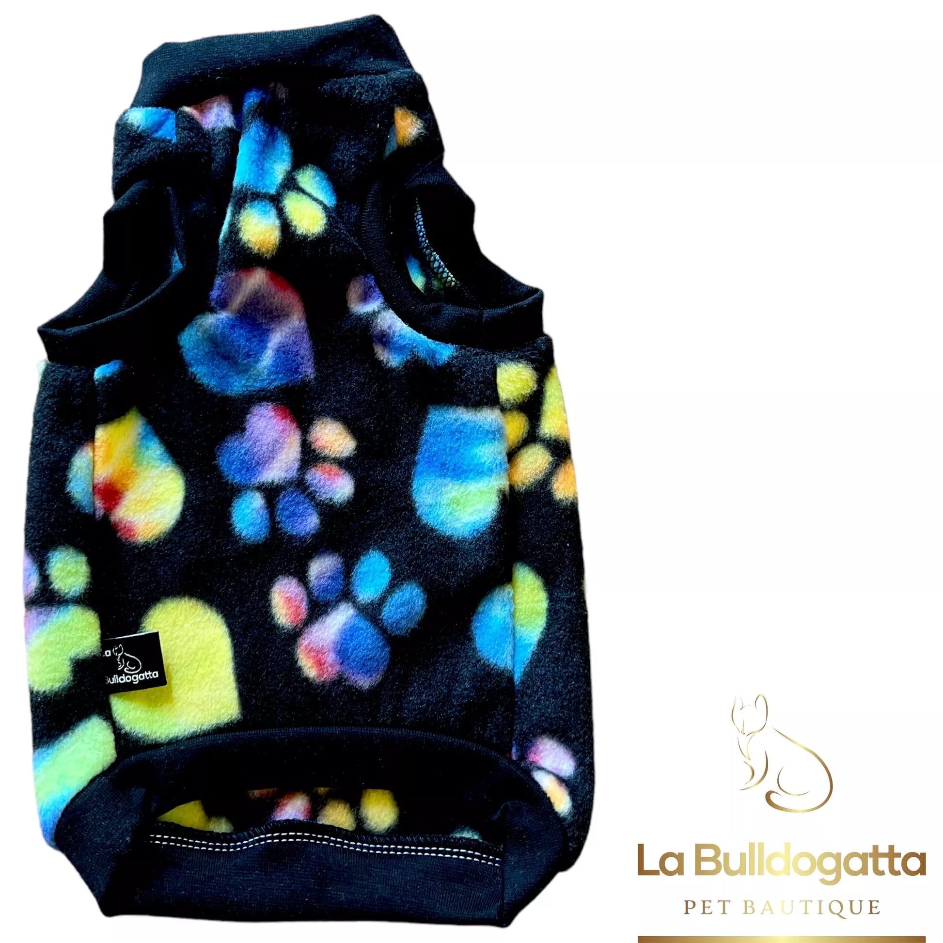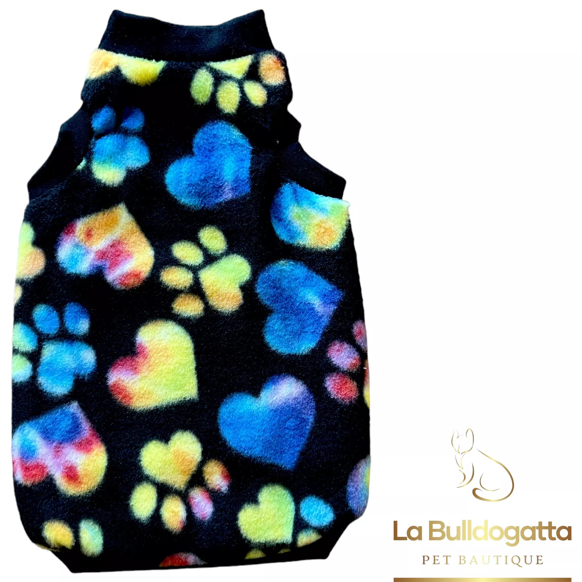 Vestitino in caldissimo pile antipilling invernale con adorabile stampa di orme e cuori multicolor , adatto per i nostri nudini più freddolosi, e anche per tenerli ben protetti se per qualche motivo dovete portarli all'esterno durante stagione autunnale e invernale.